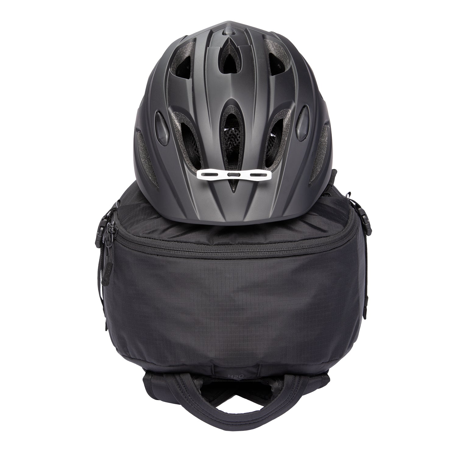 If you are travelling by bike, there is a handy aluminum hook on top of the Montagon Premium 30 for your bicycle helmet. There is a space for a bicycle lamp at the bottom of the bag, where there is also a reflective element ensuring additional visibility in the dark. When embarking on a walking tour, you can affix your walking canes by pulling them through the loops on the bottom of the bag, twisting them once and attaching them by means of the caps at the top of the side of the bag. The bag also has elastic side compartments on either side for another drinking bottle or other small items.